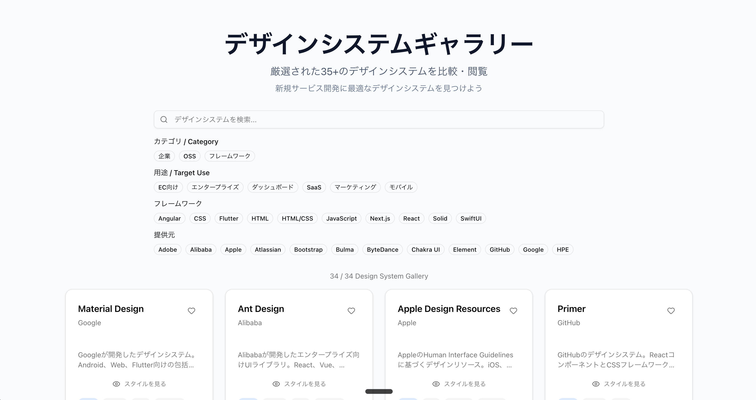 今回の検証には、デザインシステムのギャラリーサイトを使用した。ShadcnUIやRadix UIなどの有名なデザインシステムを適用した場合にコンポーネントがどのような見た目になるかをプレビューできるサイトである。