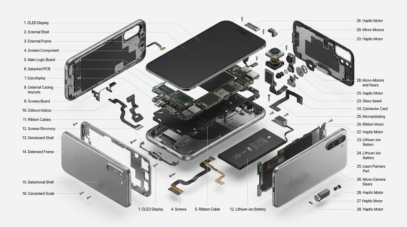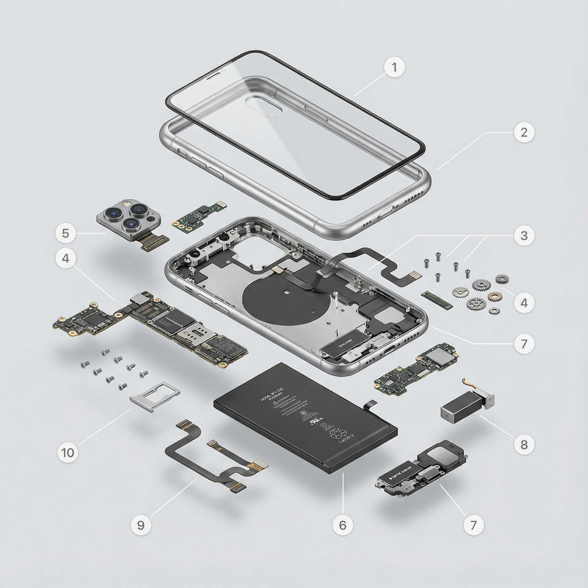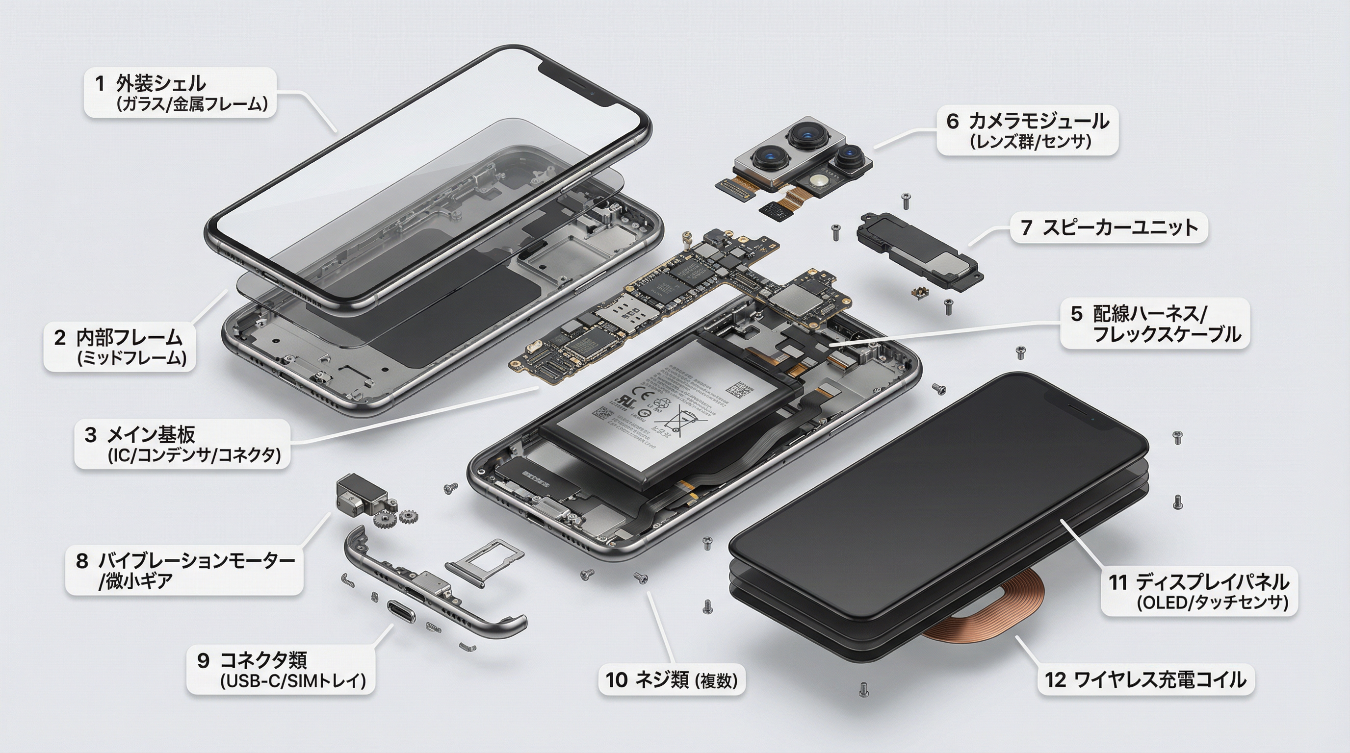 外装シェル、内部フレーム、基板、バッテリー、配線、ネジ、コネクタ、ギアやモーターなどの可動部品を、