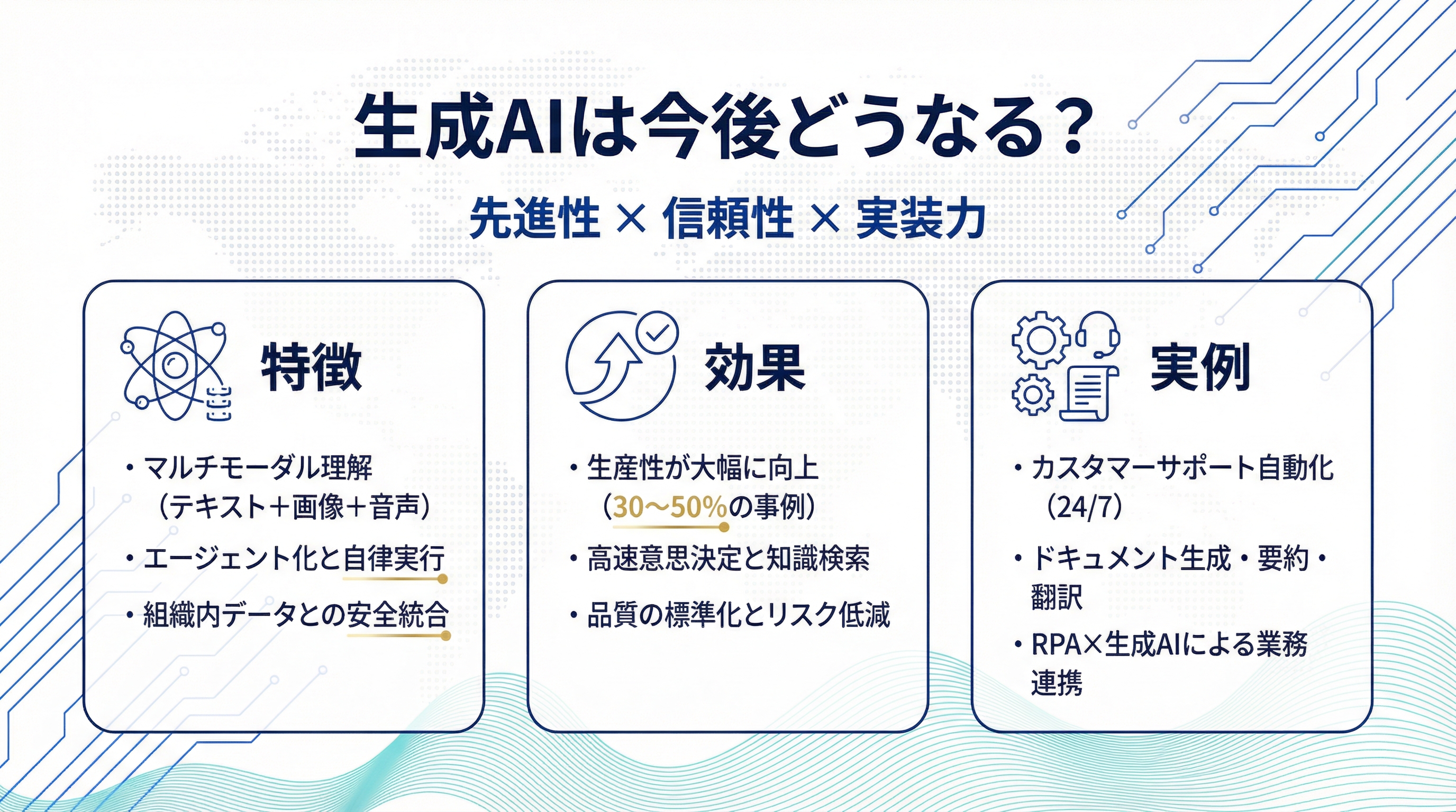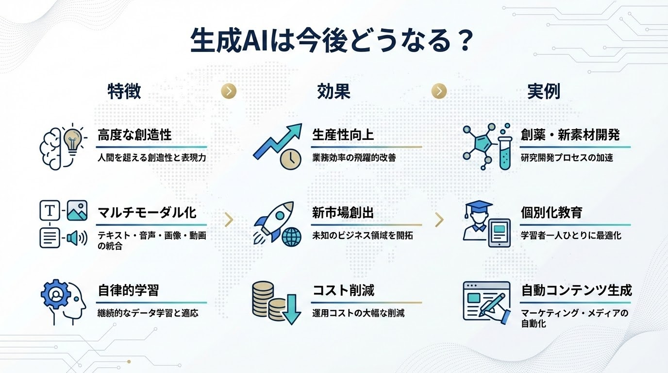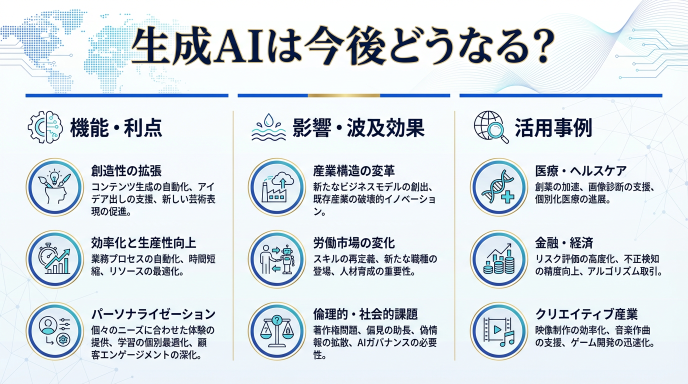 タイトル「生成AIは今後どうなる?」とした、日本語テキスト入りのプロ品質インフォグラフィック。