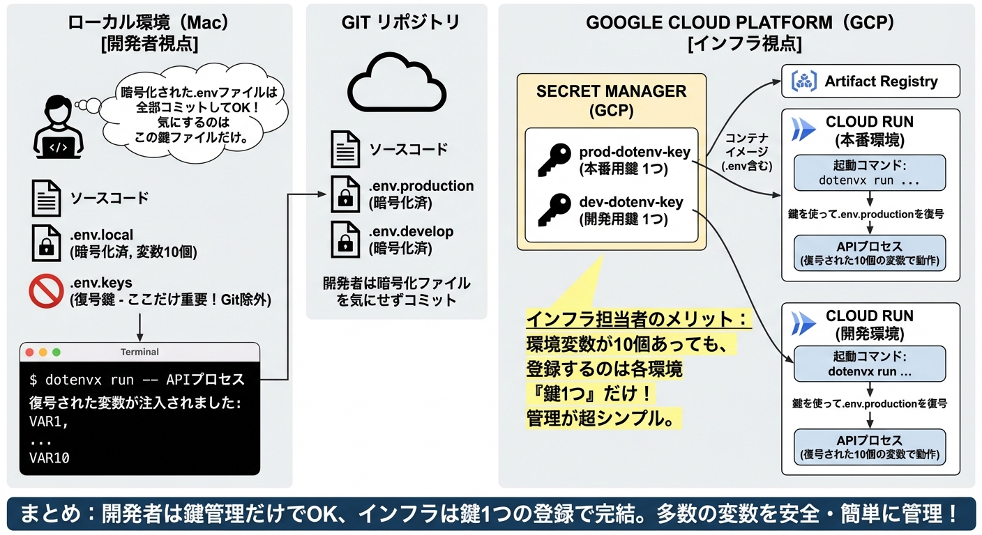 .envファイルの暗号化: 機密情報を暗号化し、安全にリポジトリにコミット可能- 環境ごとの管理: