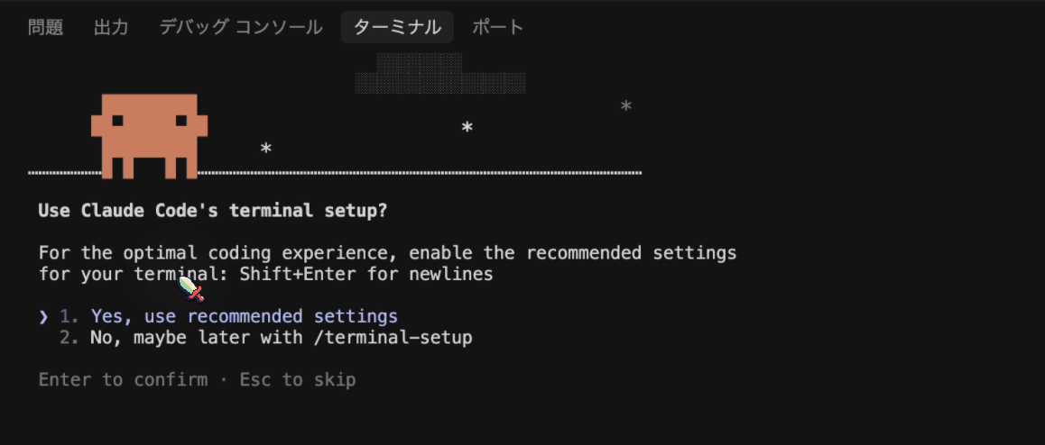1.の推奨設定を選択(Claudeと対話中にShift + Enterで改行できるようになる)