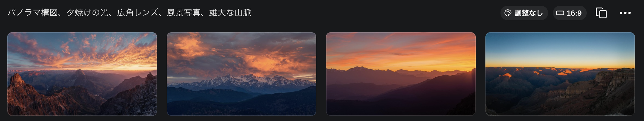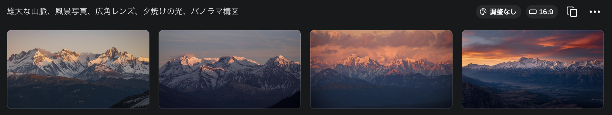 「雄大な山脈」を最初に描いたプロンプトの方が、雄大な山脈感が強く、順番を意識していない方は被写体がぼんやりとしている