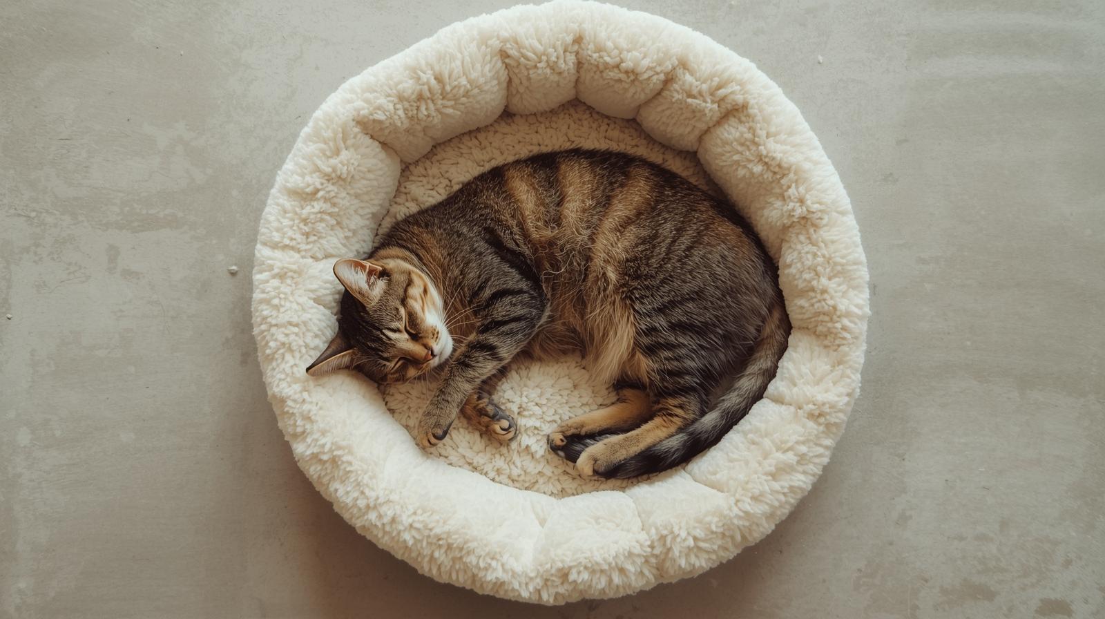 - 主題:トラ柄猫、円形の猫用ベッドで眠る
