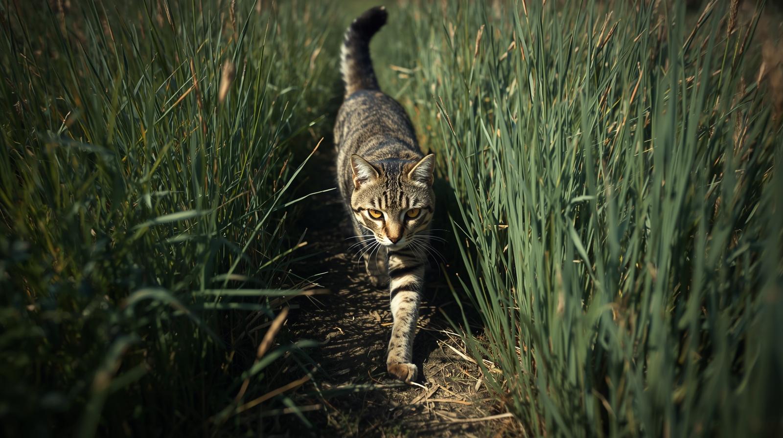 - 距離:草原を通る猫の軌跡を映すワイドショット