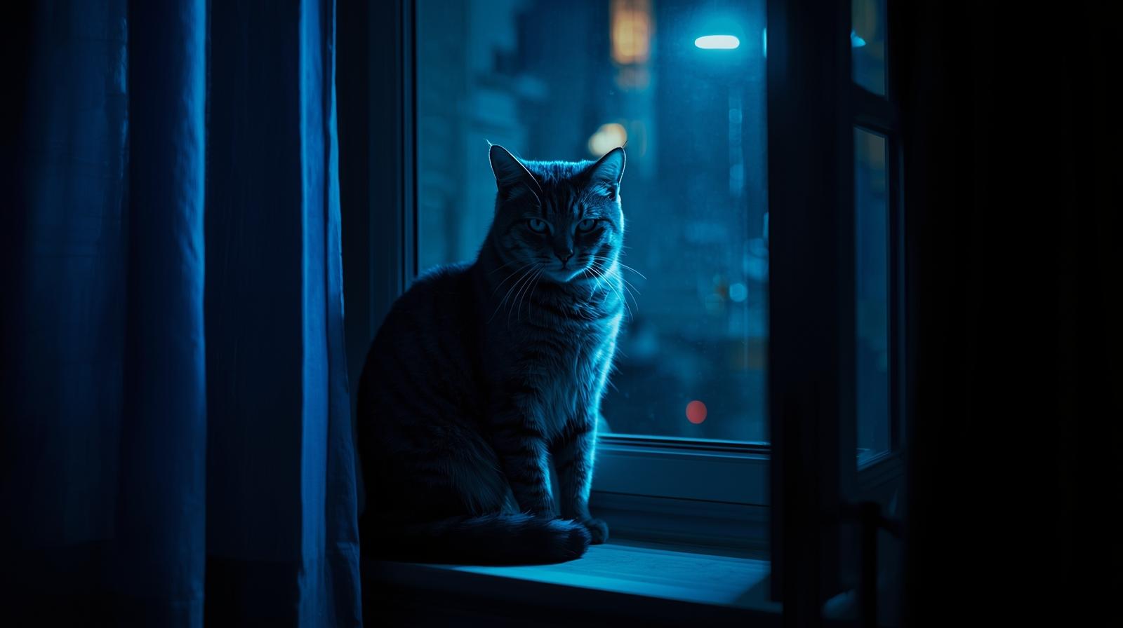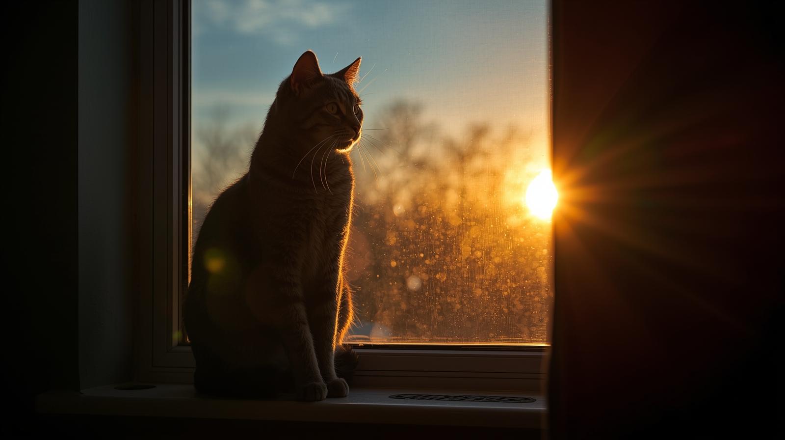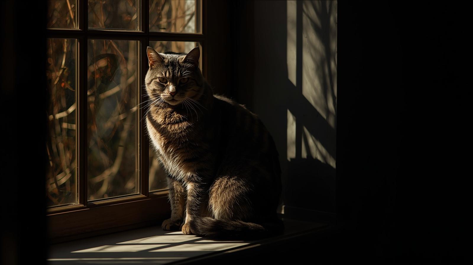 - 主題:グレーのトラ柄猫、窓辺に座る