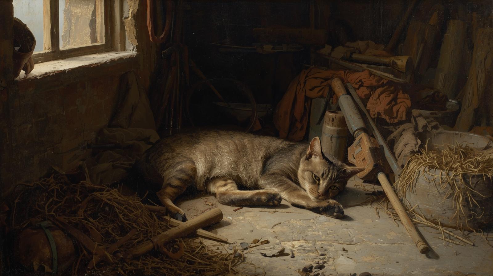 - 主題:農家の納屋で休む野良猫、自然な日常の一場面